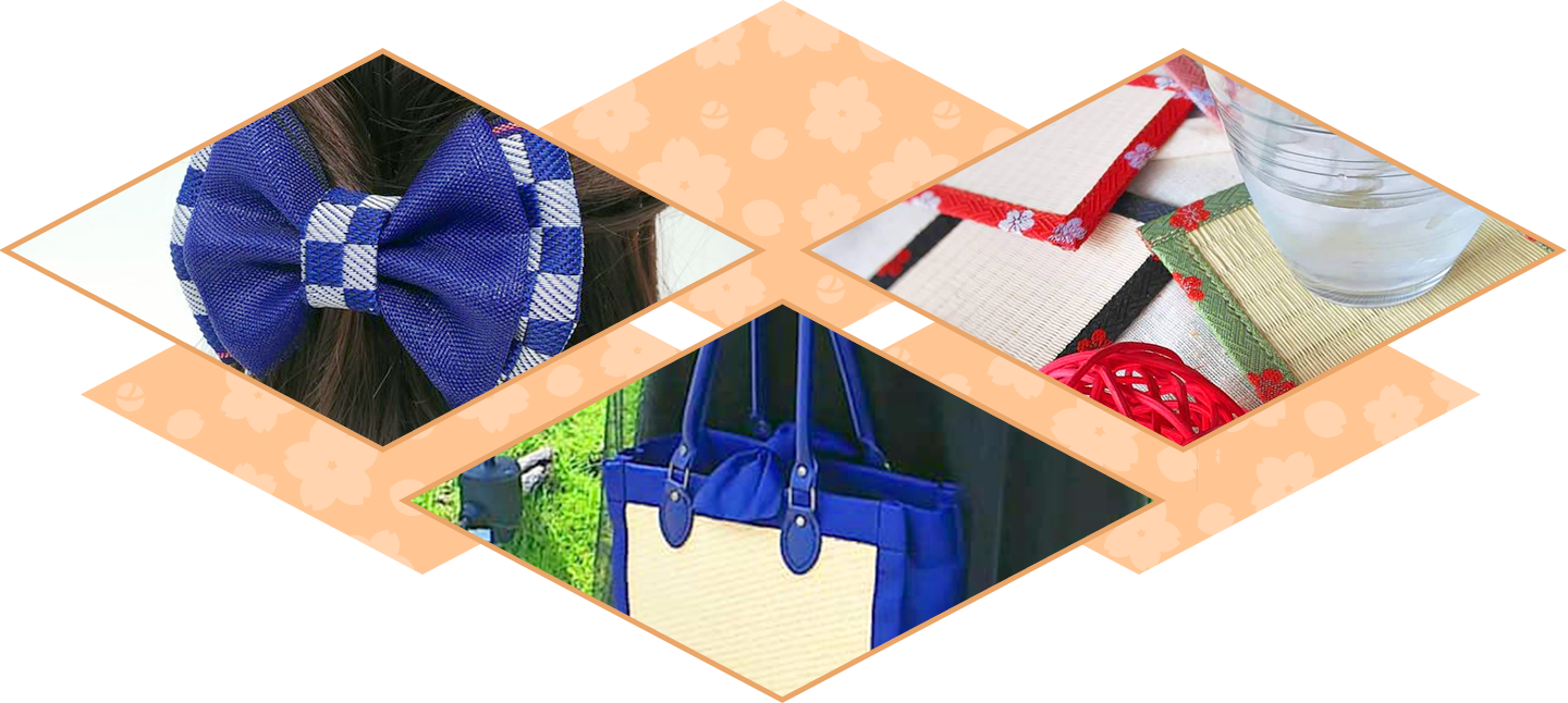 元祖畳縁リボン型アクセサリー「縁結び」をはじめ「TATAMI BAG」「畳縁BAG」「洗える畳コースター」